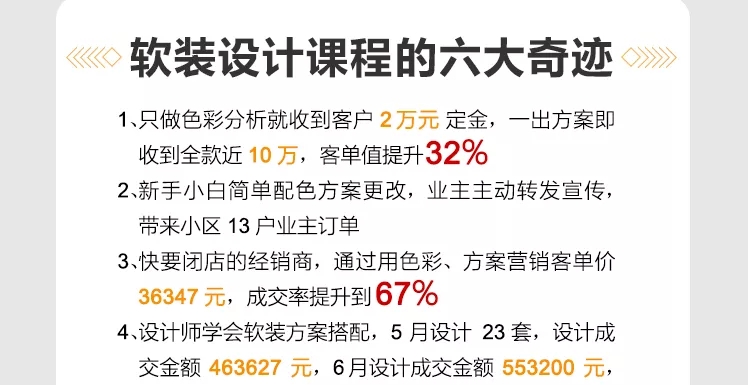 導(dǎo)讀: 軟裝設(shè)計課程的六大奇跡1、只做色彩分析就收到客戶2萬元定金,一出方案即收到全款近10萬,客單值提升32%。2、新手小白簡單配色方案更改,業(yè)主主動轉(zhuǎn)發(fā)宣傳,帶來小區(qū)13戶業(yè)主訂單。3、快要閉店的經(jīng)銷商,通過用色彩、方案營銷客單價36347元,成交率提升到67%。
